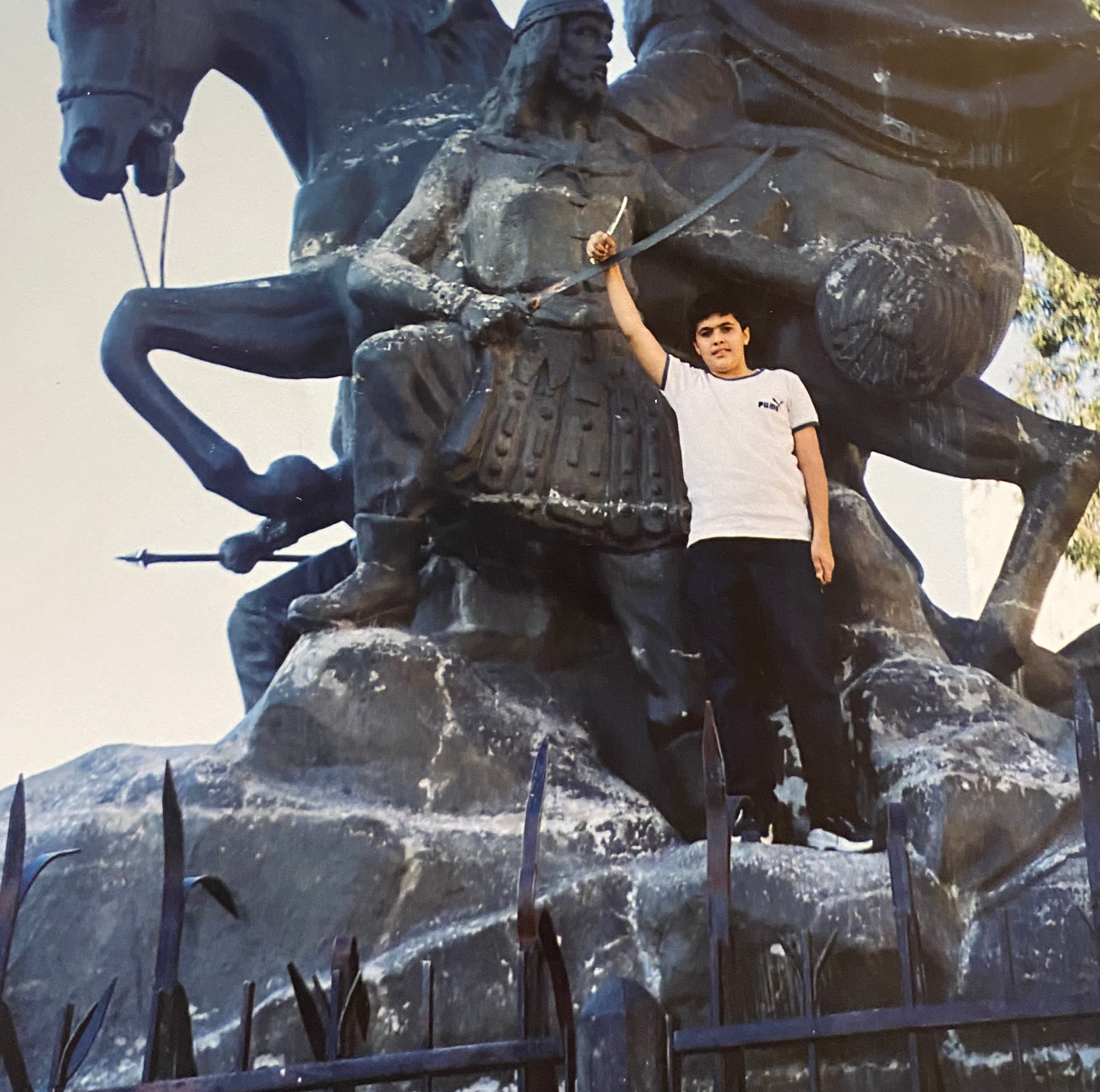 2004 yılında babam ve bir grup arkadaşının organize ettiği karayoluyla Suriye seyahatimizin Şam bölümü benim için unutulmaz bir detay ile noktalanmıştı. Şam şehir merkezinde bulunan Selahaddin Eyyübi heykeline fotoğraf çekilmek için çıkmıştım. Babam fotoğraf makinesi ile kareyi çektikten sonra geri dönerken demir korkulukların üzerinden geri dışarıya atlamam gerekiyordu. Tam da bu atlamanın gerçekleştiği sırada sağ baldırım sivri bir demire saplandı. “Allahuekber” diye bağırmam ile birlikte ve can havliyle babam da beni kendisine doğru çekince aldığım yara daha da derinleşmişti ve her taraf kan revan olmuştu. Beni hemen yere yatırdıklarını ve tampon yaptıklarını hatırlıyorum. Rehberimiz Suriyeli Yusuf abi hemen bir taksi çevirdi ve kendisi, ben, babam en yakın hastaneye yetişmek üzere taksiye bindik. Ben arka koltukta babamın dizine uzanmıştım. Hastaneye ulaştığımızda bizi hızlıca acil müdahale alanına aldılar, elleri çok hafif ve kendisi güler yüzlü bir doktor tarafından dikişler atıldı. Seyahatimin bundan sonraki kısmına yürümeyerek ve Türkiye’ye dönene kadar çoğunlukla otobüste uzanarak devam etmiştim. O seyahatten aldığım yaranın izi hala sağ baldırımda 3-4 santimlik bir çizgi şeklinde ömürlük olarak durmaktadır. Bu fotoğraf biraz sonra herkesin yüreğini ağzına getireceğinin farkında olmayan, büyük komutan Selahaddin Eyyübi’yi çok seven bir çocuğun pozudur.